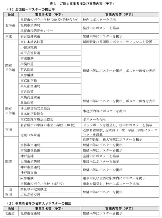 鉄道事業者(22社局)及び協会(6団体)、札幌市(200校)及び京都市(155校)及び名古屋市中区の市立小学校(10校)、札幌市消防局、大阪市消防局、神戸空港等のご協力をいただき、ポスターの掲出等を表3のとおり実施します。なお、実施開始時期及び掲出期間は、各事業者によって異なります。