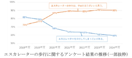 また、本キャンペーンに合わせて、2025年11月1日から、当協会公式ホームページ上で「エレベーター・エスカレーターの安全な利用に関するアンケート」(注)を実施します。本アンケートは、利用者の意識や行動について調査するために2009年度から毎年実施しております。2024年度のアンケート結果では、「エスカレーターの歩行は、やめたほうがいいと思う」と回答した人の割合が前年度に引き続き9割を超える高い水準となりました。また、「エスカレーターを歩行してしまうことがある」と答えた人の割合は60%と2018年度から6年連続で減少しました。