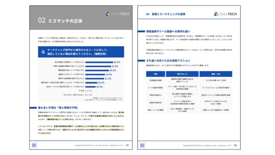 BtoBマーケティングにおいて、営業とマーケティング部門の連携は成約率を左右する重要な要素です。しかし営業責任者・担当者315名を対象としたBtoB企業のリードのミスマッチに関する実態調査では、約4割(38.7%)の営業担当者がマーケティング部門から提供されるリードの質に不満を抱いていることが明らかになりました。最も多い不満は「導入時期が不明確なリードが多い」(45.9%)で、営業が次のアクションに移せない状態が浮き彫りになっています。そこで本ガイドでは、この課題を解決するための具体的なアプローチを提示しています。調査結果から明らかになった「営業が求める情報の粒度」を満たすコンテンツ設計の手法、リードの検討段階を可視化する仕組みづくり、そして営業とマーケティングが「使える情報」の定義を共有するための連携方法について、実務に即した形で解説しています。
