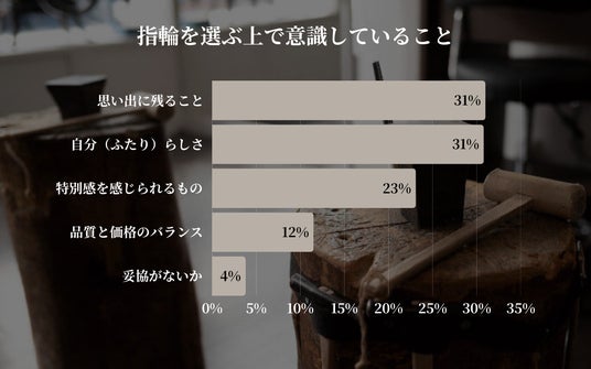 指輪選びで最も意識されたのは「思い出に残ること」と「自分(ふたり)らしさ」であり、それぞれ31%を占めました。