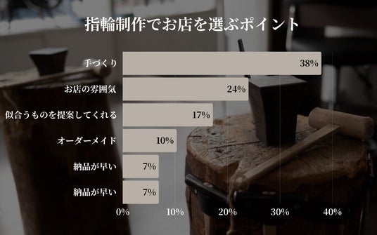 指輪制作の店選びで最も重視されたのは「手作り」であり、38%を占めました。