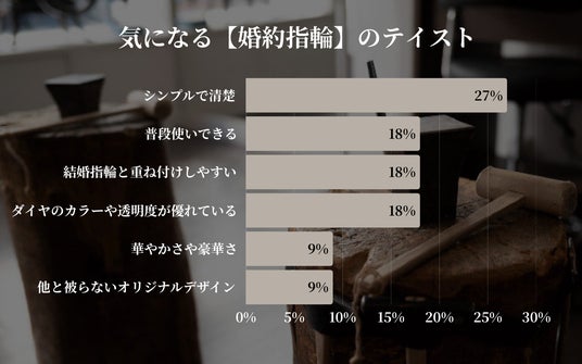 婚約指輪のテイストとして、「シンプルで清楚」(27%)なデザインを求める人が最も多い傾向にあります。次いで、「普段使いできる」(18%)、「結婚指輪と重ね付けしやすい」(18%)、「ダイヤのカラーや透明度が優れている」(18%)といった実用性や品質を重視する層が同程度でした。一方、「華やかさや豪華さ」(9%)、「他と被らないオリジナルデザイン」(9%)を求める層は比較的少数派です。