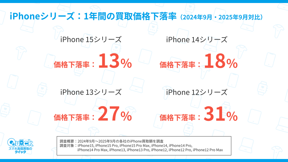 iPhone15シリーズは2024年9月から2025年9月にかけて、買取価格下落率が13%だったのに対し、iPhone13シリーズの買取価格は27%下落、iPhone12シリーズは1年間で30%以上、買取価格が下落していることが分かりました。