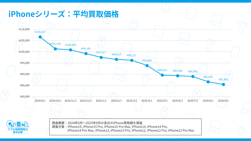 全国160店舗以上に展開する「スマートフォン買取のクイック」を運営する株式会社ブループリント(本社 東京都新宿区、代表取締役 中村 友昭、以下「当社」)は、「スマートフォン買取業者のiPhone買取価格の推移調査」(以下「本調査」)を実施しました。