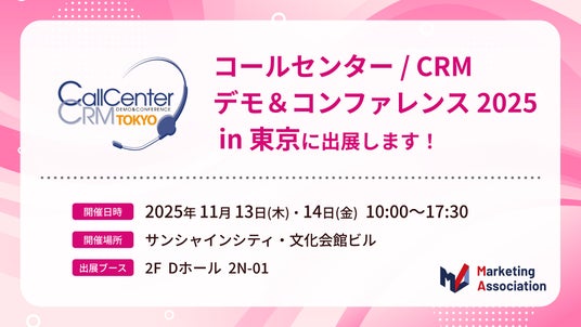 コールセンター代行サービスを運営するマーケティングアソシエーション株式会社(本社:東京都台東区 代表取締役:中園広和、以下当社)は、2025年11月13日(木)~14日(金)の2日間、サンシャインシティ・文化会館で開催される『コールセンター/CRM デモ&コンファレンス2025 in 東京』(https://www.callcenter-japan.com/tokyo/)に出展致します。