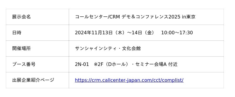 本展示会は日本最大のコンタクトセンター業界特化の展示会で、当社は今回で9回目の出展になります。皆さまのご来場をお待ちしております。