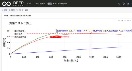 AIによる施策シミュレーション結果と最大利益の条件を可視化