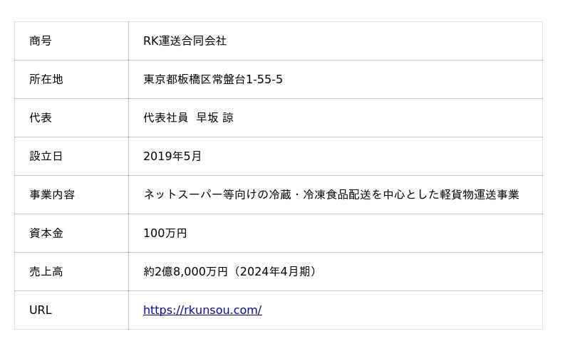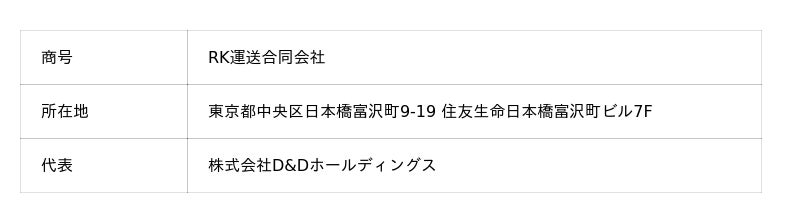 株式会社D&Dホールディングス(本社:東京都中央区、代表取締役社長:竹村 嘉規)は、冷凍・冷蔵貨物を主とする軽貨物配送事業を手掛けるRK運送合同会社(本社:東京都板橋区、代表社員:早坂 諒)と持分譲渡契約を締結し、2025年10月31日付で完全子会社化いたしましたのでお知らせいたします。