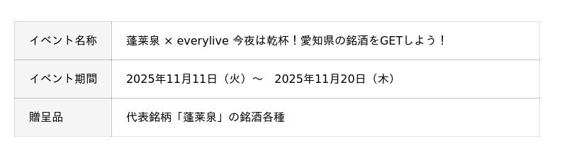エブリライブ株式会社(本社:東京都港区、代表取締役:影山和義)は、愛知県に本社を置く老舗酒蔵「関谷醸造株式会社」とのコラボイベントを開催いたします。イベントの上位入賞者には関谷醸造株式会社の代表銘柄「蓬莱泉」の銘酒が贈呈されます。