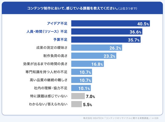 A.弊社が2025年6月に実施した調査「コンテンツのリサイクルに関する実態調査」によると、4割以上(40.5%)が「コンテンツ制作の課題」として“アイデア不足”を挙げており、同時に「リソース不足」も大きな障壁となっていることがわかりました。
