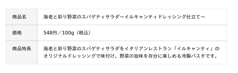 『海老と彩り野菜のスパゲティサラダ~イルキャンティドレッシング仕立て~』は、大きめの海老、トマトや紫キャベツなどの彩り野菜とスパゲティをイルキャンティのオリジナルドレッシングで味付けし、フライドガーリックをトッピングしました。野菜の旨味を存分に楽しめる冷製パスタです。『かぼちゃ・れんこん・きのこの季節のグリーンサラダ』は、サラダカフェでは定番の季節の野菜を使ったサラダに、イルキャンティのドレッシングを添えました。旬の秋野菜と4種のきのこを中心に12品目の食材を使用。秋の味覚に素材の旨味をいかしたドレッシングがよく合うグリーンサラダです。どちらも、サラダカフェの持つ、野菜本来の力を引き立たせるサラダづくりのノウハウと、イルキャンティのドレッシングの魅力がかけ合い、野菜の可能性を広げるメニューに仕上がりました。また、商品の販売期間中、サラダカフェの店舗でもイルキャンティのドレッシングの販売を行います。