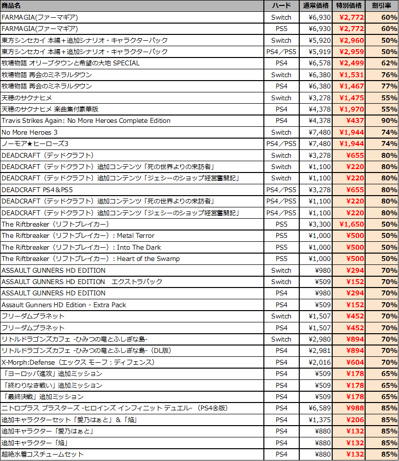 期間中、Nintendo Switch(TM)/PlayStation(R)5/PlayStation(R)4向けの、『牧場物語』シリーズ、『天穂のサクナヒメ』など、全14タイトルおよび有料DLCが最大90%OFF!