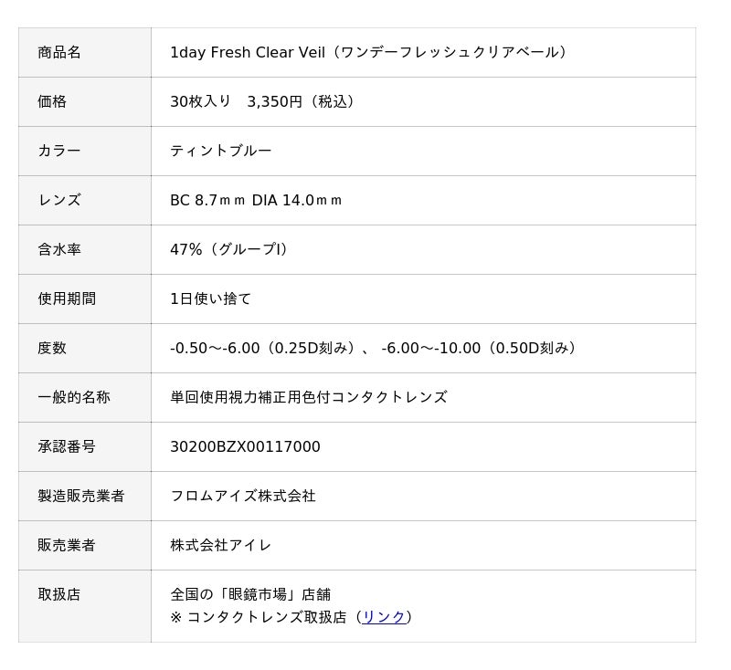 株式会社メガネトップ(本社:静岡県静岡市、代表取締役社長:冨澤昌宏、以下「眼鏡市場」)は、DK/L187という高い酸素透過率を実現したオリジナルコンタクトレンズ『1day Fresh Clear Veil(ワンデーフレッシュクリアベール)』を、全国の眼鏡市場店舗にて販売開始しました。