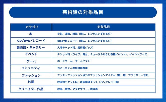 アーティストやクリエイターの作品、美術館・個展の入場料、映画や音楽ライブのチケット代、最近ではファッションデザイナーを応援する目的で、服などのファッションアイテムを購入する際にも使用可能とし、非常に幅広い品目が対象となっています。