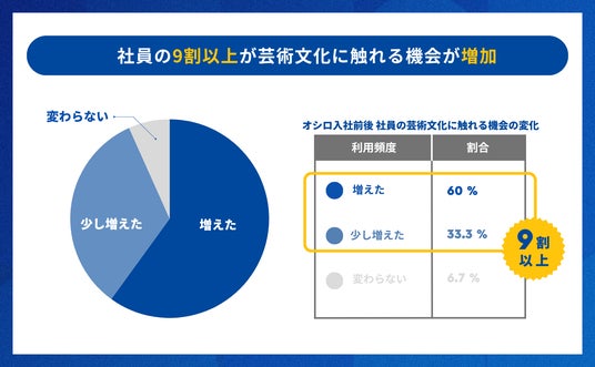 実際に全社員がほぼ毎月「芸術給」を利用しており、約93%の社員がオシロ入社前後(芸術給があること)で芸術文化に触れる機会が増えたと回答しました。