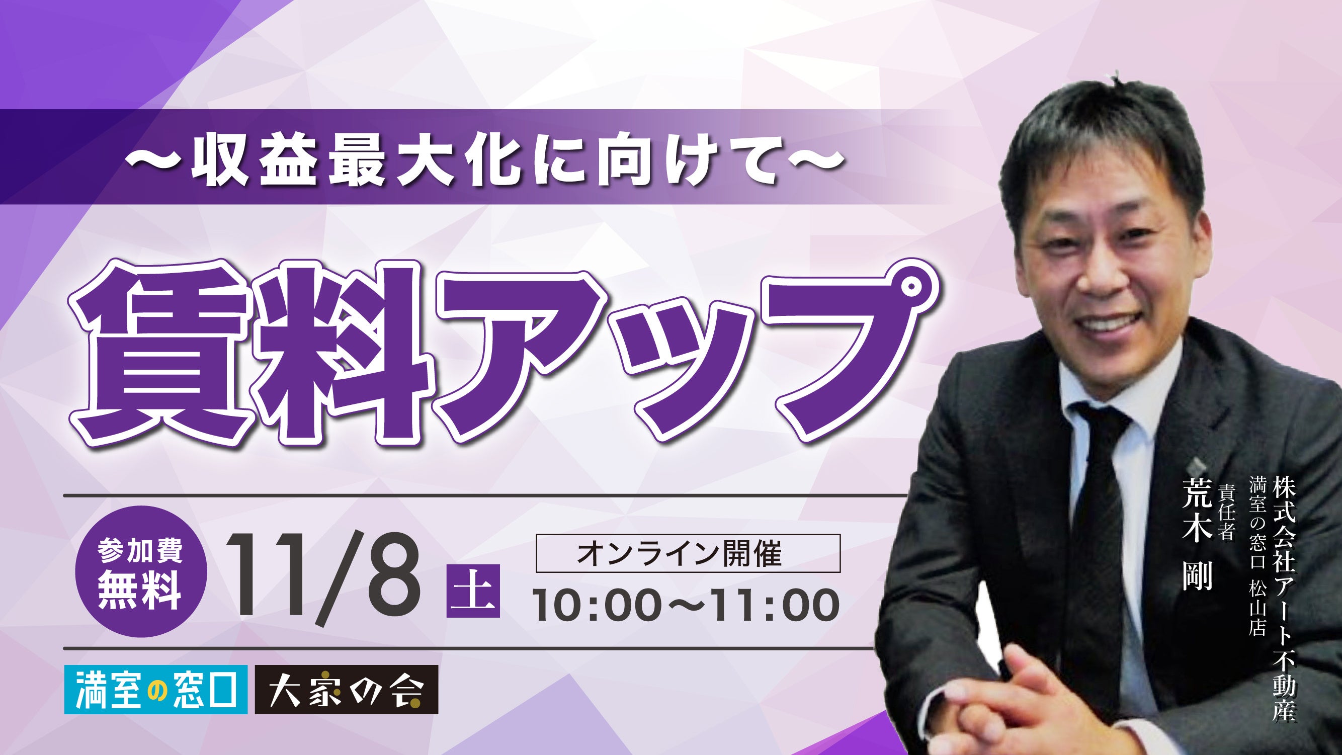 今回のセミナーでは、株式会社アート不動産 満室の窓口 松山店 責任者 荒木 剛氏を講師に、セミナーを開催します。当日は、「賃料アップ~収益最大化に向けて~」と題して、最新の賃貸経営に関するノウハウを解説します。
