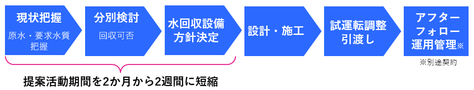 当社は長年の半導体・液晶工場における施設運営の経験をもとに、排水負荷の低減を目指した工場用水の利活用を促進するサービスとして「水回収サービス」を提供してきました。本サービスは、工場全体の工場用水の利用状況を分析・調査し、水回収に適した排水系統を見極め、製造設備間を効率よく循環できる水回収設備の設置等の工事を立案・提案するものです。また、SDGsのひとつ「安全な水の確保と持続可能な管理」の達成に貢献するとともに、取水コストや排水コストを抑制する効果も見込めます。