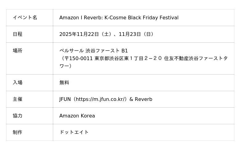 韓国コスメの最新トレンドを日本でキュレートするイベント「Reverb」を展開し、コマース専門パフォーマンスマーケティング、ショッピングモール構築から、国内/東南アジアマーケティングまでを担う株式会社JFUN(ジェイパン 本社:ソウル錦川区 代表:チュ・ヒョンホ)は、韓国の有名ブランドから日本初上陸のブランドまで、多数の韓国コスメブランドが一同に集結する、体験型ポップアップイベント「Reverb x Amazon: K-Cosme Black Friday Festival」を、2025年11月22日(土)・23日(日)の2日間、東京・渋谷のベルサール ファーストタワーで開催します。
