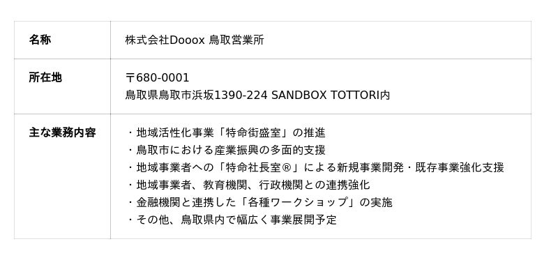 “行動で世の中を変えていく“を理念に掲げる株式会社Dooox(本社:東京都品川区、代表取締役:久保寺亮介)は、鳥取県鳥取市に新たに営業所を開設しました。本営業所は、多様な人々が集うコラボレーション拠点「SANDBOX TOTTORI」内に設置され、新たな事業共創の拠点として機能します。地域の事業者、教育機関、行政機関の皆様との連携を深めながら、鳥取市が持つ独自の魅力と資源を最大限に活かした事業創出を通じて、地域経済の持続的な発展に貢献してまいります。