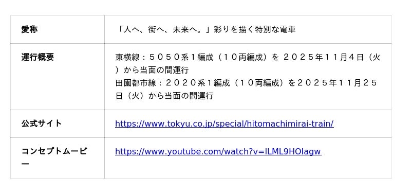 株式会社ヘラルボニー(本社:岩手県盛岡市、代表取締役 Co-CEO:松田 崇弥、松田 文登、以下「ヘラルボニー」)は、「人へ、街へ、未来へ。」をコーポレートスローガンに掲げる東急電鉄株式会社(本社:東京都渋谷区、取締役社長 福田 誠一氏、以下「東急電鉄」)との共創プロジェクト第1弾として、当社契約アーティスト・中島敏也氏が描いた作品をデザインしたアートラッピング電車『「人へ、街へ、未来へ。」彩りを描く特別な電車』の運行開始をお知らせします。車両は2025年11月4日(火)から東横線、同25日(火)から田園都市線にて、それぞれ1編成ずつ運行します。