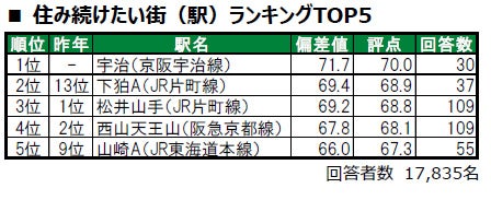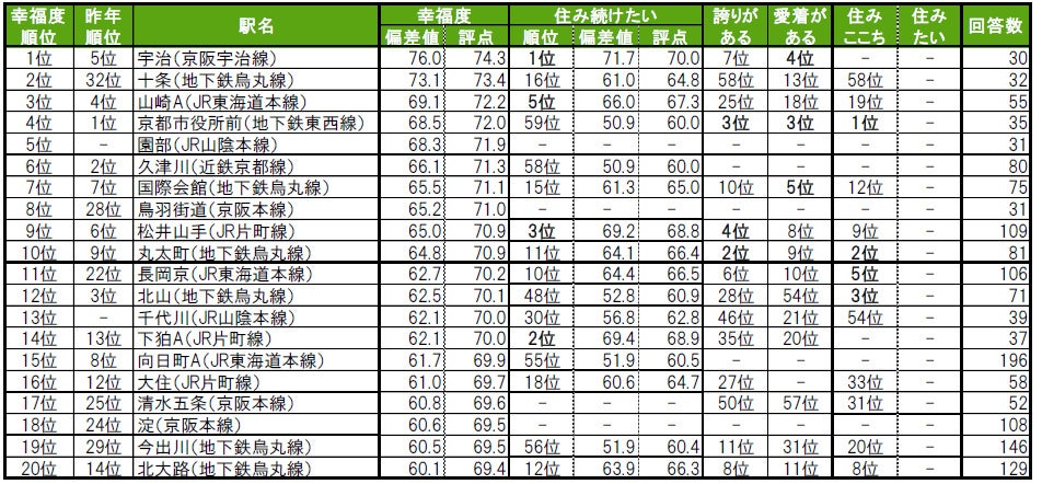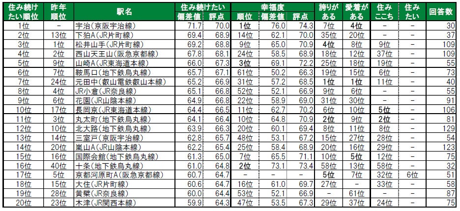 宇治市に位置する宇治が、昨年5位から順位を上げて1位に輝きました。2位は京都市南区に位置する十条で、昨年32位から大きく順位を上げてのランクインです。3位は、昨年4位から一つ順位を上げた山崎A(大山崎・山崎を統合)です。今回初登場でトップ10入りしたのは5位の南丹市に位置する園部で、昨年は累計回答者数が30名未満でランキングの集計対象外でした。その他、8位の京都市東山区に位置する鳥羽街道が、昨年28位から順位を上げてトップ10入りしています。