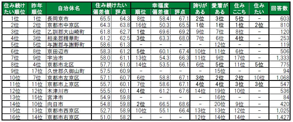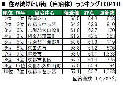 1位は、4年連続で長岡京市です。2位は2年連続で京都市中京区で、「住みここち」で1位となっている街です。3位は、昨年6位から順位を上げた乙訓郡大山崎町です。その他トップ10内では、9位の久世郡久御山町が昨年17位から順位を上げてトップ10入りしています。