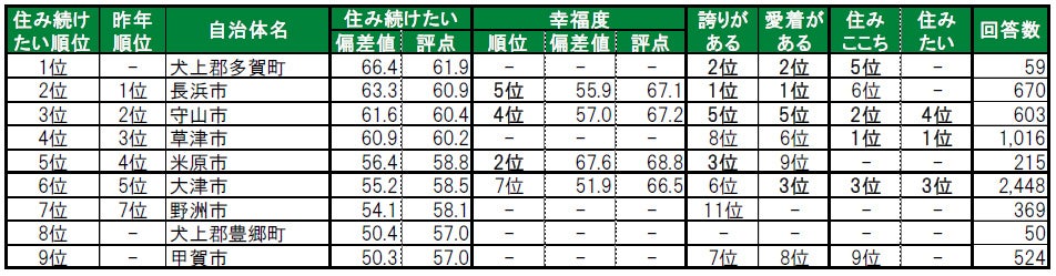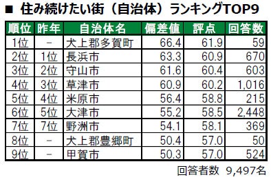 1位は、初登場の犬上郡多賀町です。2位は長浜市、3位は守山市です。今回初登場でトップ9入りしたのは、1位の多賀町、8位の豊郷町(とよさとちょう)で、いずれも犬上郡に属する町です。いずれも昨年は累計回答者数が50名未満で、ランキングの集計対象外でした。