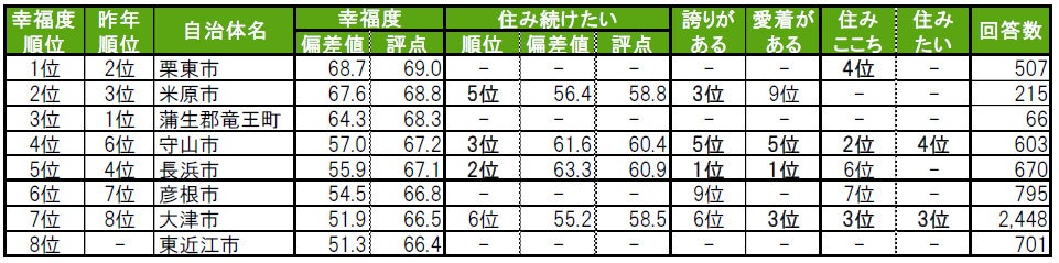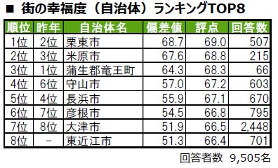 1位は栗東市で、昨年2位から順位を上げてトップに輝きました。2位は昨年3位から順位を上げた米原市、3位は蒲生郡竜王町(がもうぐん りゅうおうちょう)です。トップ8内では、昨年は偏差値50未満で順位を公開していなかった東近江市が8位にランクインしています。