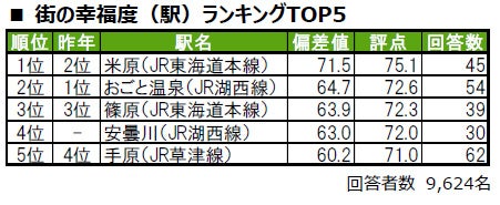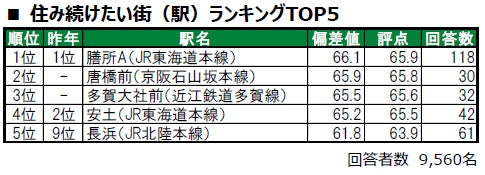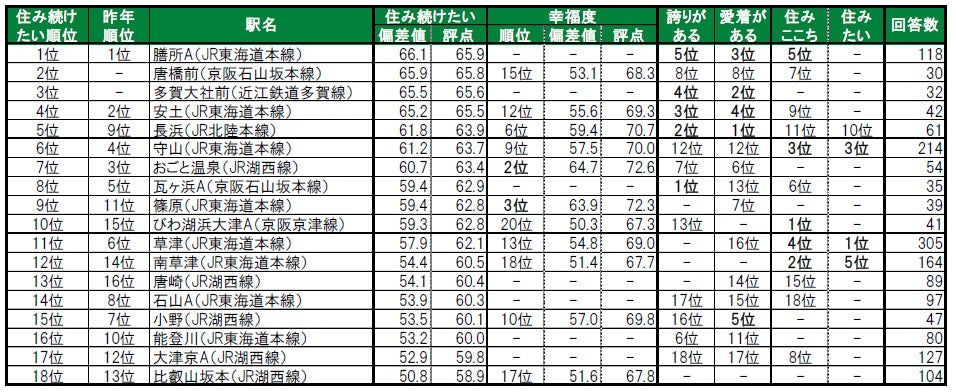 米原市に位置する米原が、唯一偏差値70台の高い評価を得て1位に輝きました。2位は、大津市に位置するおごと温泉です。3位は、2年連続で近江八幡市に位置する篠原です。その他今回初登場でトップ10入りしたのは、4位の安曇川、8位の太郎坊宮前(たろぼうぐうまえ)で、いずれも昨年は累計回答者数が30名未満でランキングの集計対象外でした。
