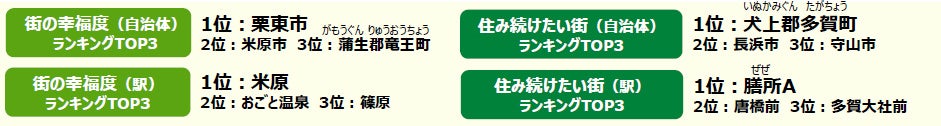 ※「街の幸福度(駅)・住み続けたい街(駅)」は、駅徒歩15分以内に居住している回答者が30名以上の駅を、「街の幸福度(自治体)・住み続けたい街(自治体)」は、回答者50名以上の自治体を対象として集計しています。