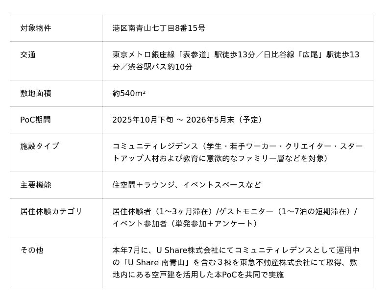 U Share株式会社(本社:東京都渋谷区、代表取締役:上田 真路)は、東急不動産株式会社(本社:東京都渋谷区、代表取締役社長:星野 浩明)と連携し、東京都港区南青山七丁目においてコミュニティレジデンス事業のPoC(実証実験)を開始することをお知らせいたします。