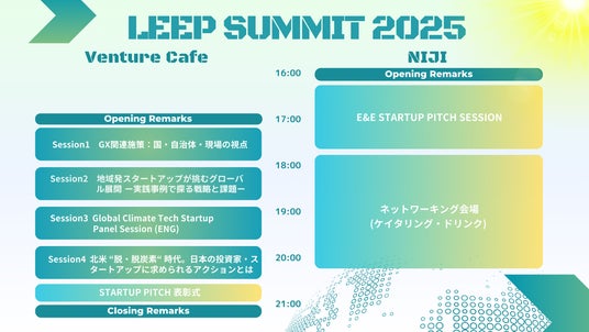 LEEP SUMMITはE&Eコミュニティが実施する年間最大のイベントで、今年で5度目の開催となります。今年度のLEEP SUMMITでは「環境エネルギー "共創と実践" -国と都市を越えて- 」をメインテーマに、日本各地のスタートアップや各地で活躍するベンチャーキャピタル、海外の気候テックスタートアップが集結します。国内外の最前線で活躍するプレイヤーによるピッチ、パネルディスカッション、ネットワーキングを通じて、実践的なイノベーション創出につながる機会を提供します。本分野に興味のある企業、スタートアップ、起業家、研究者、大学や研究機関、官公庁、自治体、投資家など、数多くのプレイヤーが一堂に会するイベントになりますので、ぜひご参加ください。
