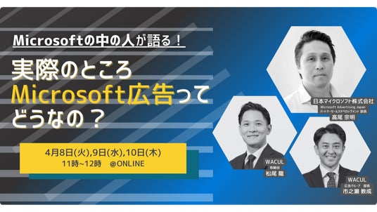 当社とマイクロソフトの連携に伴い、「Microsoftの中の人が語る!実際のところMicrosoft広告ってどうなの?」と題した、2社共催セミナーを開催します。セミナーでは、日本マイクロソフト株式会社の高尾氏が登壇し、Microsoft広告の運用のポイントについて解説します。