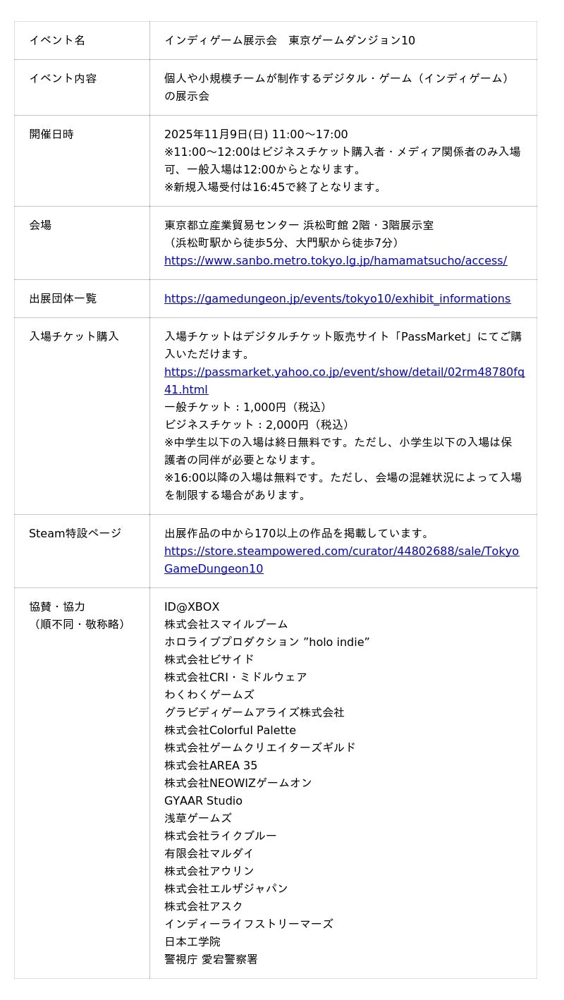 ゲームダンジョン事務局(会社名:株式会社f岩崎、本社:東京都中野区)は、日本国内の個人や小規模チームが作るインディゲームの展示会「東京ゲームダンジョン10」を、2025年11月9日(日)に東京都立産業貿易センター浜松町館2階・3階展示室にて開催いたします。