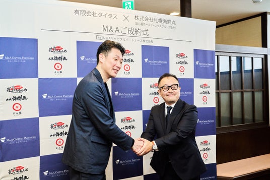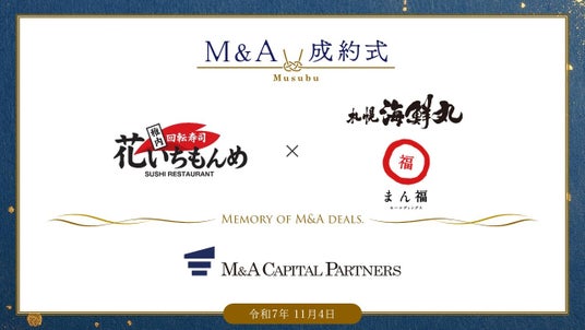 M&Aキャピタルパートナーズ株式会社(東京都中央区・代表取締役社長 中村悟)は、回転すし店「花いちもんめ」を運営する稚内市の有限会社タイタスと、札幌市に本社を構え、持ち帰り寿司店を主に事業展開を行う株式会社札幌海鮮丸(日本の食に特化した事業承継プラットフォームを展開するまん福ホールディングスのグループ会社)のM&Aを仲介いたしました。2025年11月4日に、花いちもんめ稚内本店にて、M&A成約式を開催いたしました。