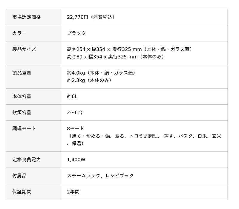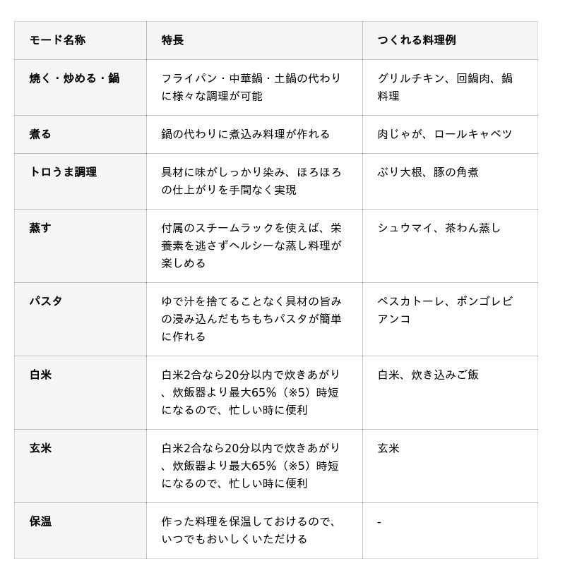 8つの調理方法(焼く・炒める・煮る・蒸す・炊く・ゆでる・とろ火で煮込む・お鍋)を可能とし、8個の調理器具の機能(フライパン、中華鍋、鍋、せいろ、炊飯器、寸胴、スロークッカー、土鍋)を一台で叶えられる万能クッカーです。