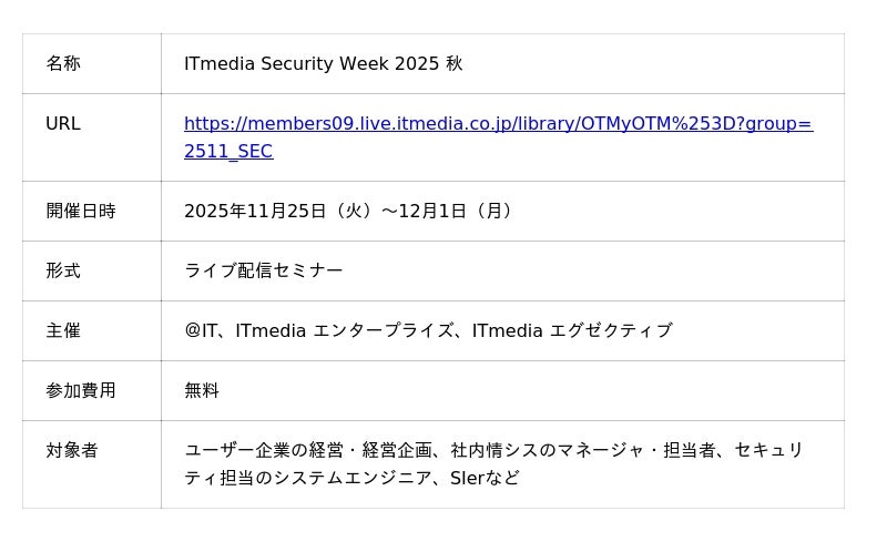 アイティメディア株式会社(本社:東京都千代田区、代表取締役社長 兼 CEO:小林教至、以下アイティメディア)は、2025年11月25日(火)~12月1日(月)に「ITmedia Security Week 2025 秋」を開催します。本イベントは、「@IT」「ITmedia エグゼクティブ」「ITmedia エンタープライズ」の3媒体が主催するデジタルイベントで、情報システム担当者やセキュリティ担当のエンジニアなどに向けて、「自社の本業」と「セキュリティ人材の本分」を伸ばす仕組み化に向けた現実的な道標を、8つのセクションで提示します。