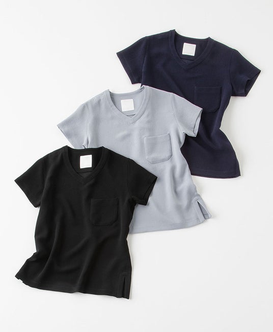 素材はシワの模様と膨らみが上品なフクレ二重織素材を採用。シボ感とふくらみ、上品な風合いと滑らかな肌触りが魅力です。丸めて持ち運んでもシワになりにくい携帯性と、心地よい伸びを感じる縦横のストレッチ性、軽量、ノンアイロンといった高い機能性も兼ね備えています。また、一部にリサイクルポリエステルを用いた環境配慮設計です。