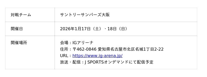 チケットに関する詳細は、ウルフドッグス名古屋公式ページ(https://www.wolfdogs.jp/)または、IGアリーナ公式ページ(https://www.ig-arena.jp/)をご覧ください。