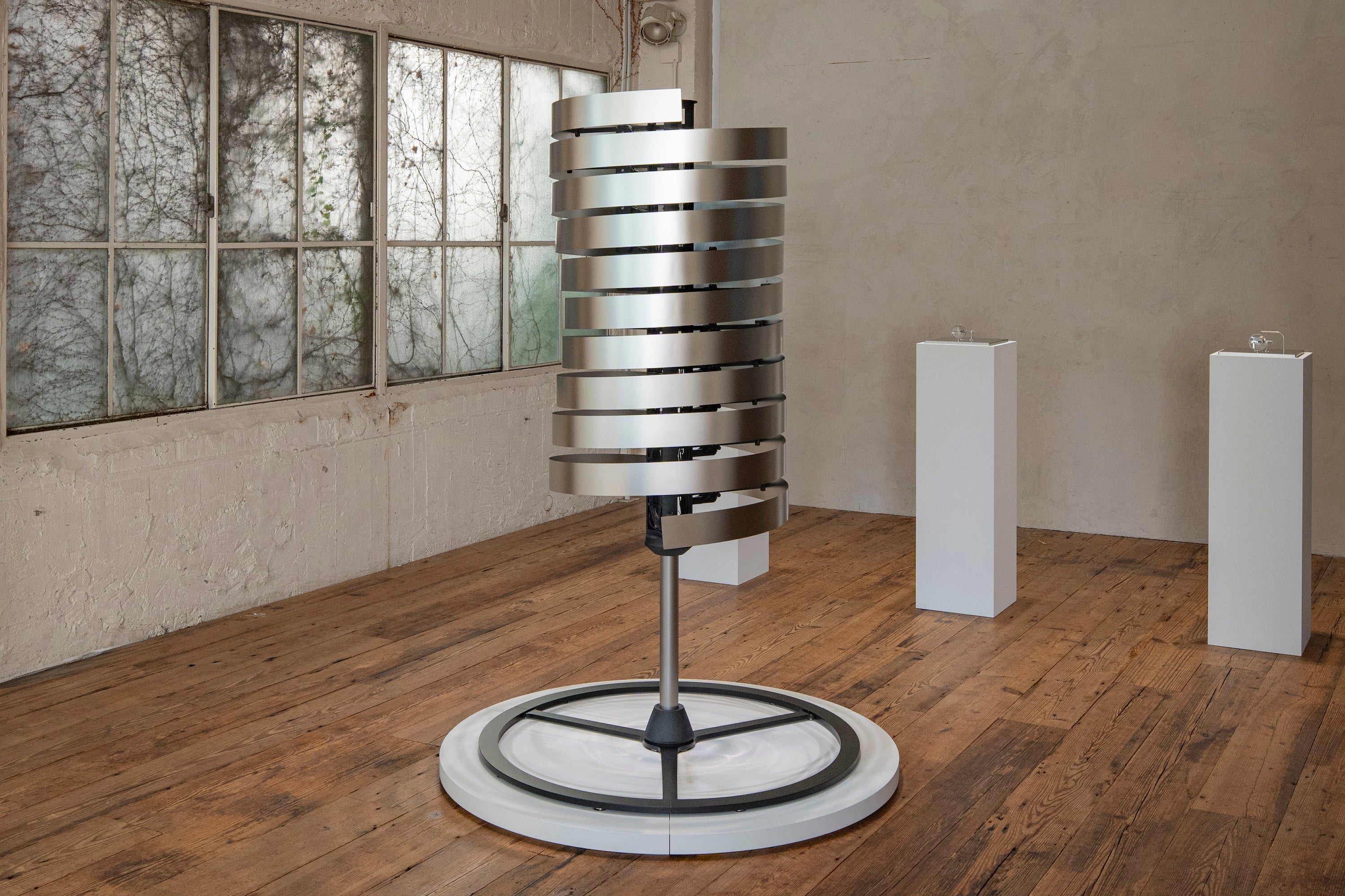 複数のアームによって支えられる長くしなやかなステンレス板の螺旋構造。各アームはそれぞれが独立して伸縮することで螺旋に緊張や緩和をもたらします。また、そのたわみは全体に干渉し合うことで、刻一刻と新たな秩序を生み出し続けます。