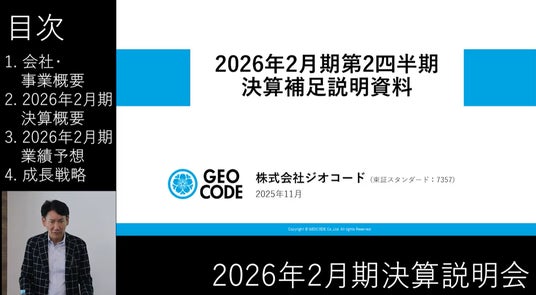ジオコード、2026年2月期 第2四半期の決算説明動画を公開