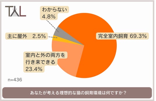 飼い主436名に対し「あなたが考える理想的な猫の飼育環境は何ですか?」と質問したところ、圧倒的多数の約7割が「完全室内飼育」(69.3%)と回答しました。そのほか、「室内と外の両方を行き来できる」(23.4%)、「主に屋外」(2.5%)、「わからない」(4.8%)という回答も見られました。