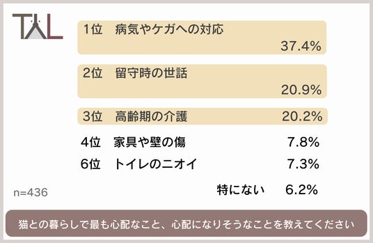 飼い主436名に対し「猫との暮らしで最も心配なこと、心配になりそうなことは何ですか?」と質問したところ、約4割の飼い主が「病気やケガへの対応」(37.4%)と回答しました。また「留守時の世話」(20.9%)、「高齢期の介護」(20.2%)などの回答が見られ、飼い猫の健康管理に関する不安要素が多い結果となりました。そのほか、「家具や壁の傷」(7.8%)や「トイレのニオイ」(7.3%)といった回答も見られました。