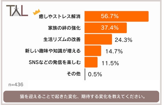 ・猫を飼うことで飼い主の日常生活全般にポジティブな影響を期待または実感していることは、癒しやストレス解消、家族の絆の強化、生活リズムの改善など。