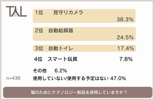 飼い主436名に対し「猫のためにテクノロジー製品を使用していますか?使用しているもの、または、使用したいものをお選びください。」と質問したところ、「見守りカメラ」(38.3%)や「自動給餌器」(24.5%)、「自動トイレ」(17.4%)などを中心に普及が進んでいることが分かりました。一方で、「使用していない/使用する予定はない」と回答した方も47.0%と半数近く見られたことから、テクノロジーの導入については意見が分かれる結果となりました。