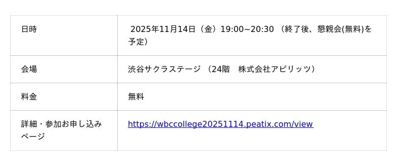 アピリッツ、11/14(金)WBCカレッジ【HCDトレーニングセンター・ウメムラボvol.03】を開催