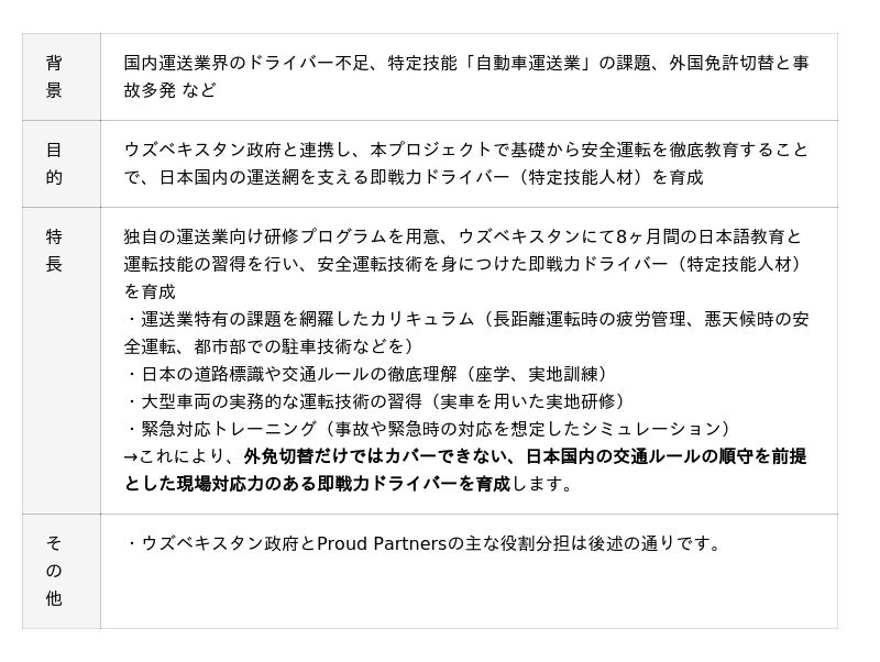 今回、イズミ物流との大規模な共同育成契約の締結を受け、Proud Partnersは、ウズベキスタン人ドライバーが来日後に即戦力として勤務できるよう、研修期間中にイズミ物流が定める「安全基準の教育」を実施します。