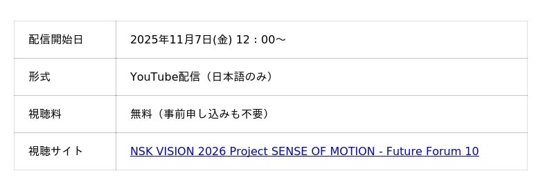 日本精工株式会社(本社:東京都品川区、代表者:取締役 代表執行役社長・CEO 市井 明俊、以下NSK)は、本日、NSK Future Forum 10の動画を公開しました。