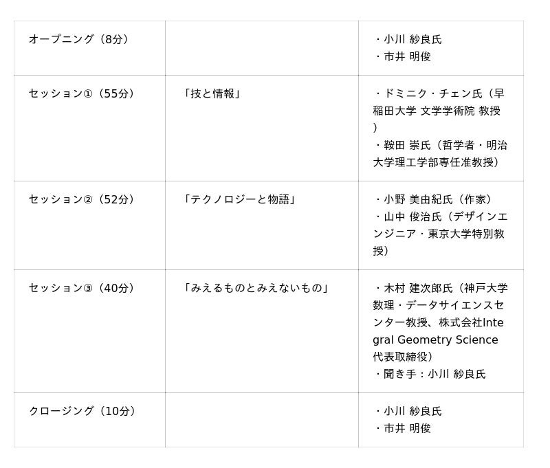 ゲストには、大学で発酵メディア研究ゼミを主宰し、「発酵」概念に基づいたテクノロジーデザインの研究を進めているドミニク・チェン氏(早稲田大学 文学学術院 教授)、小説・エッセイなど多岐に渡る執筆や、SFプロトタイパーとして様々な企業との共創プロジェクトに参画している小野美由紀氏(作家)、10年の歳月をかけて、応用数学史上の未解決問題である「波動散乱の逆問題」を世界で初めて解決することに成功した木村建次郎氏(神戸大学 数理・データサイエンスセンター教授、株式会社Integral Geometry Science 代表取締役)他をお招きしています。
