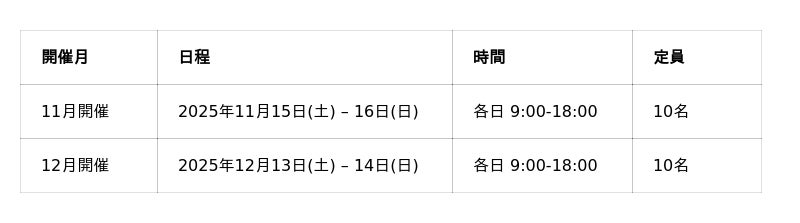 - 完全実践型: 2日間で最低1つの実用的なツールを開発し、持ち帰ることが可能。